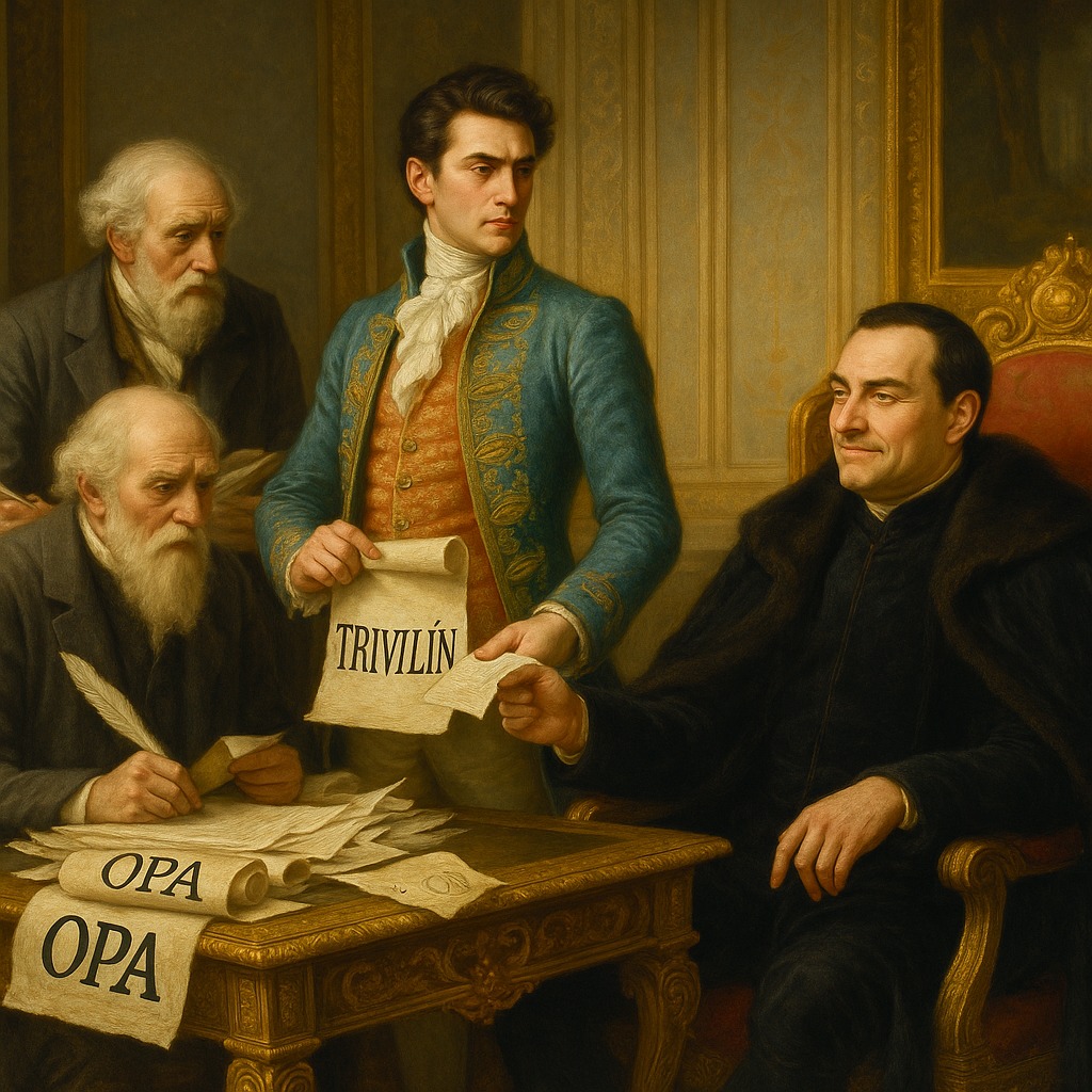 Ha estallado un nuevo escándalo que sacude las copas de jerez y hace temblar los pasillos de la prensa cortesana. Esta vez, el protagonista del bochinche no es otro que el Comerciante del Espejismo, el Ambicioso Trivilingüe, gringo del verbo veloz, conocido en las fiestas por su risa ladeada, su amor por los balones rodantes y su capacidad de levantar imperios con la misma facilidad con que un cortesano pide otro whisky.