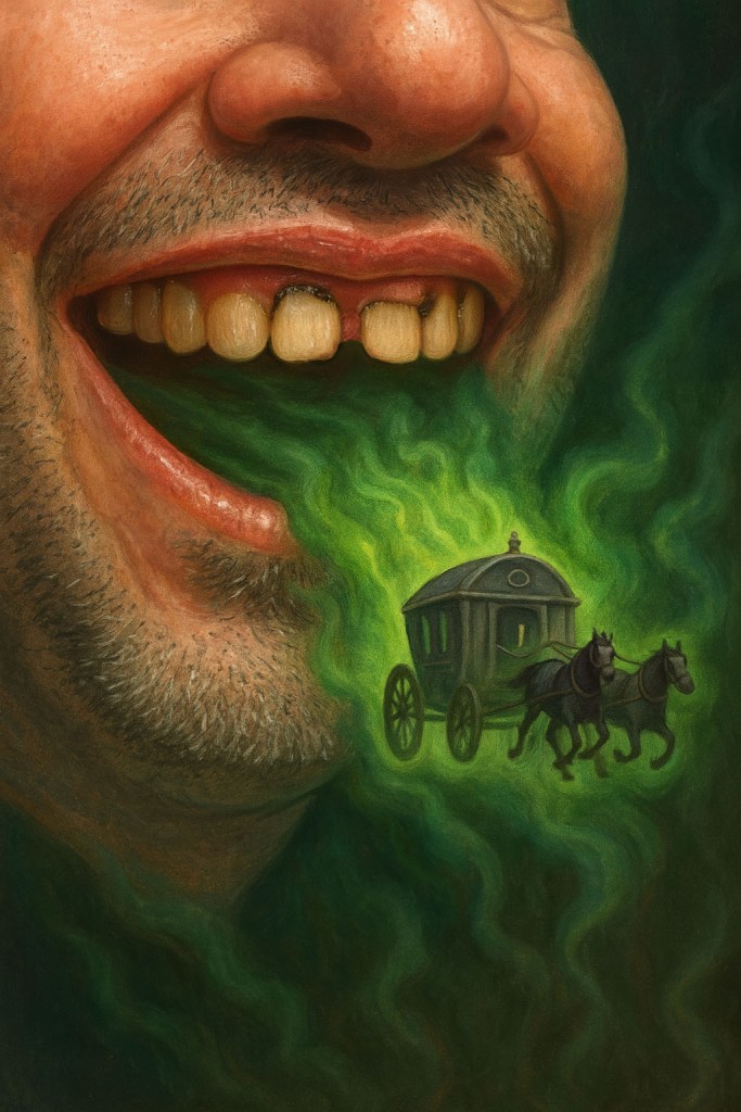 Vinieron los vómitos, los sudores, las pesadillas. Y en los sueños, entre la bruma púrpura y la sangre de los presupuestos desperdiciados, lo vi. El Rey, con su corona torcida, se acercaba. Y al abrir la boca para hablar, distinguí claramente sus dientes: grandes, separados por un diastema profundo, como portales a otros mundos. Dientes por los que se escapan los discursos huecos y las promesas jamás cumplidas. Pero lo peor es que aún no puedo explicar cómo en un sueño me imaginé la pestilencia que se escapa de esa fauce del narcisismo.