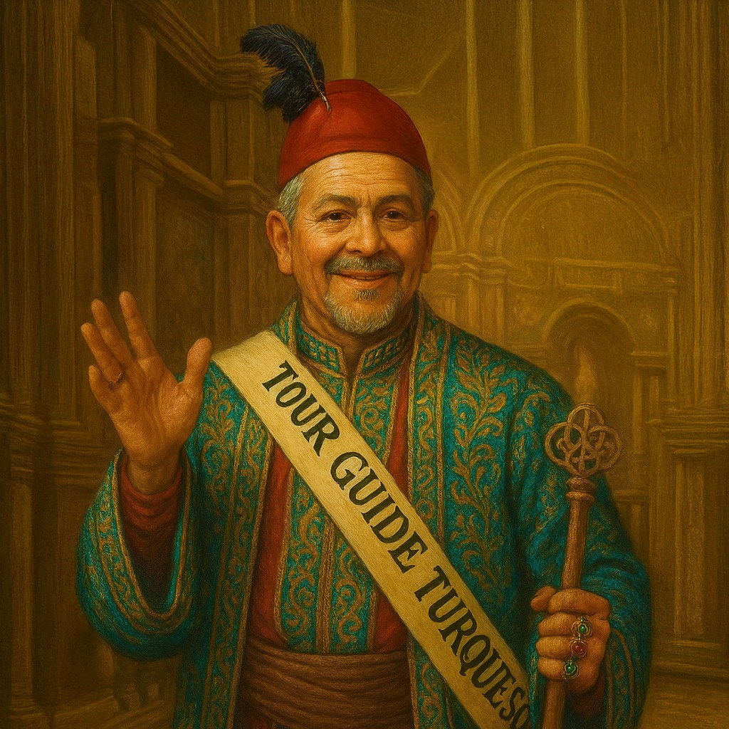 ¡Turqueso como guía turístico del Parlamento de los Suspiros! ¡Qué mejor embajador para explicar la arquitectura de cajones mientras se discute el financiamiento del crimen organizado desde un mantel con servilletas de lino! “Por aquí se aprueban presupuestos, por allá se filtra la Torre del Tribunal, y si miran bien, en ese rincón está la honestidad… o lo que queda de ella.”