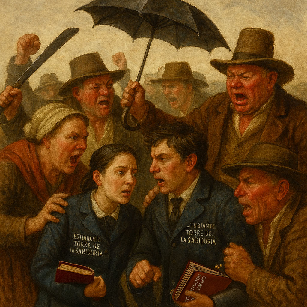 Y mientras esto ocurría, en la misma Nicoa, un grupo de aprendices del saber de la Torre de Marfil Rebelde fue expulsado del acto real. Empujados, insultados, golpeados con parasoles, como si fuesen amenazas y no portadores de pensamiento. Cuando ya estaban fuera, apareció la Guardia Real, haciendo gala de su puntualidad inversa. Guarito, lejos de apaciguar, se burló con su voz aguardentosa: cuatro lindos gatitos, dijo, y hasta pidió lástima por ellos, como si la dignidad se pudiera mancillar con sarcasmos.