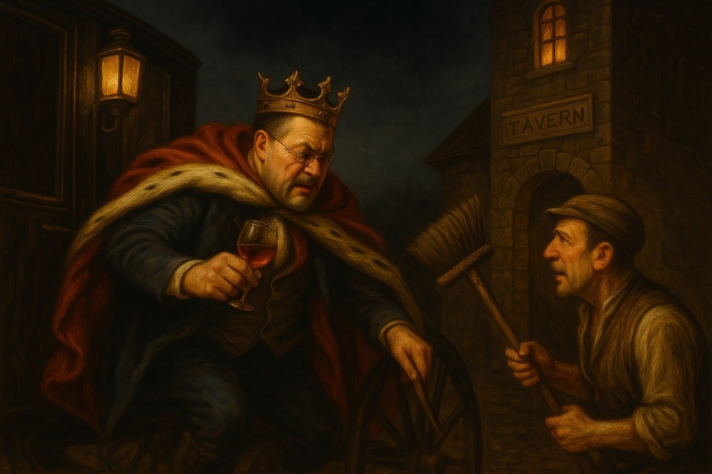 Y he aquí el escándalo: el mismísimo Rey Guarito I ha sido visto en dicho lugar. No una, ni dos, sino varias veces. Llegando solo, sin pajes, sin escoltas, sin cochero, sin fanfarria. ¿Quién conduce el carruaje? Pues él mismo, me asegura Sir Geo. Como si fuera un mozo del establo, se aparece tambaleante, con el aliento encendido por bebidas espirituosas, pidiendo más. Y el tabernero, alma valiente del Reino, lo ha echado a escobazos. No una, ni dos, sino varias veces también. Porque Su Desgracia Real insiste en volver, como mosca al néctar del desprestigio.