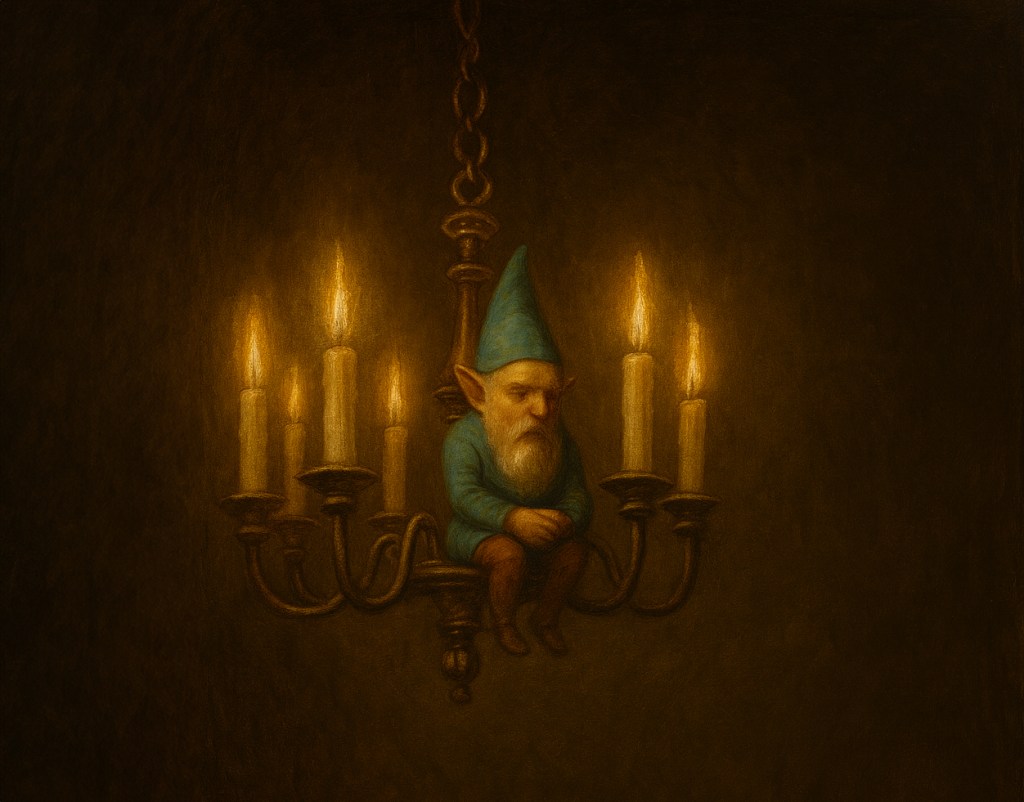 Y mientras tanto, en las Redes del Vulgo, poetas de Tictolandia componen coplas de burla, las escribanas y los escribanos de Feisburgo reproducen su caída, y hasta los ecronistas cortesanos y bufones del algoritmo se preguntan si el gnomo del candelabro fue real o si fue solo otro reflejo de vanidad en los espejos del poder. Hasta sus mismos troles bajan la cabeza con vergüenza.